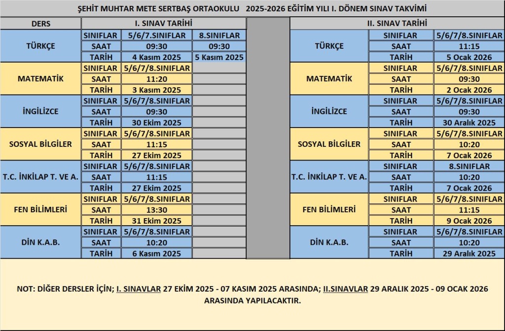 2025-2026 Eğitim Öğretim Yılı 1. Dönem Sınav Takvimi
